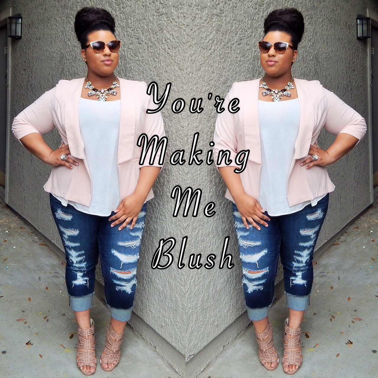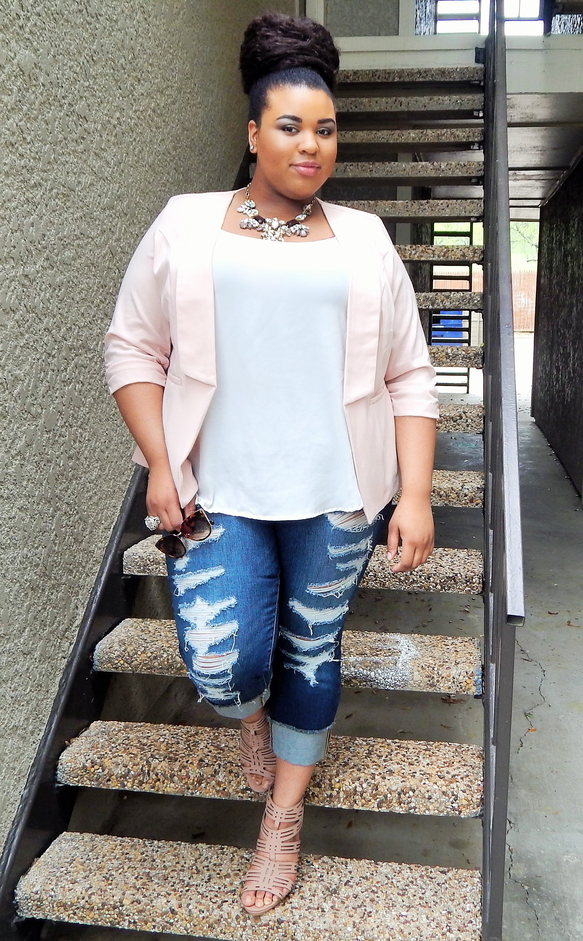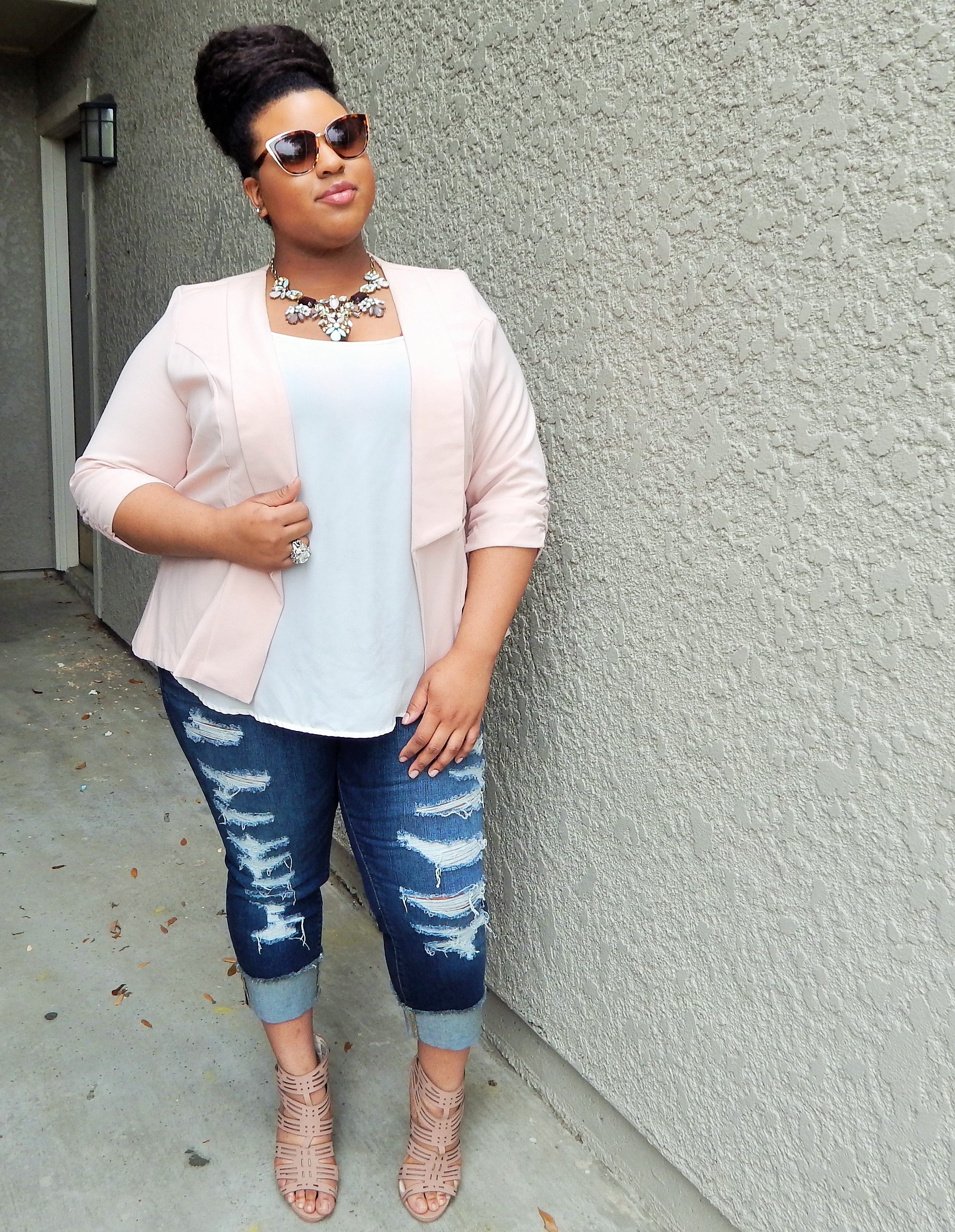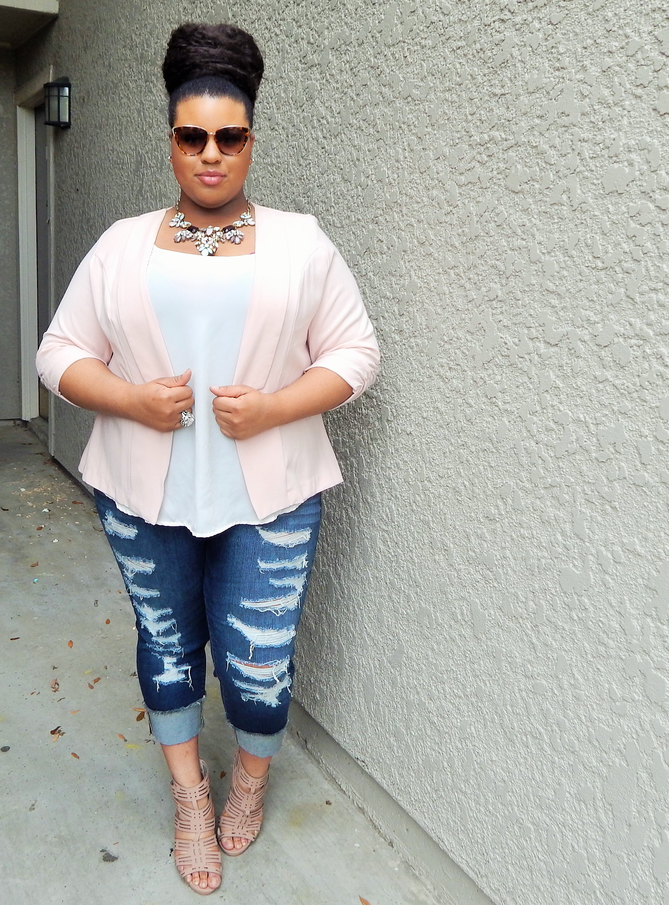 So, I posted this work OOTD the other day and I received some questions about where the items were from. The entire outfit is from Torrid, of course. This blush pink blazer is one of the cutest blazers I’ve bought from Torrid and I pray we come out with more colors. It does run small, so go up one size when you purchase. I normally get 2’s but I bought a 3 in this one. It has more room in the arms, which is just what I need. I wore the same ivory chiffion tank and necklace from a previous post. I have on Torrid’s White Label Distressed Boyfriend Crop. I LOVE THESE PANTS! They are true to size, so no need to go up or down. I love the detail in these crops, especially the wash and destruction. The bottom cuff is not sewn, so you can adjust for your height. I prefer the white label, which most of Torrid denim is now, because of the better quality fabric that is used. It is worth the money. Torrid just starting selling sunglasses and they are the cutest! My sunglasses have leopard print and gold lining the frames. I normally don’t wear sunglasses but it’s Spring, so what the heck! My newest addition to my shoe collection are these blush cutout, cage heels. They are super comfortable and just the right height. I believe they have 4 1/2 inch heel. This a perfect outfit for hanging with friends or going to a casual spring event. Pairing a blazer with any jean dresses it up and gives that extra ummph. More pictures are below!