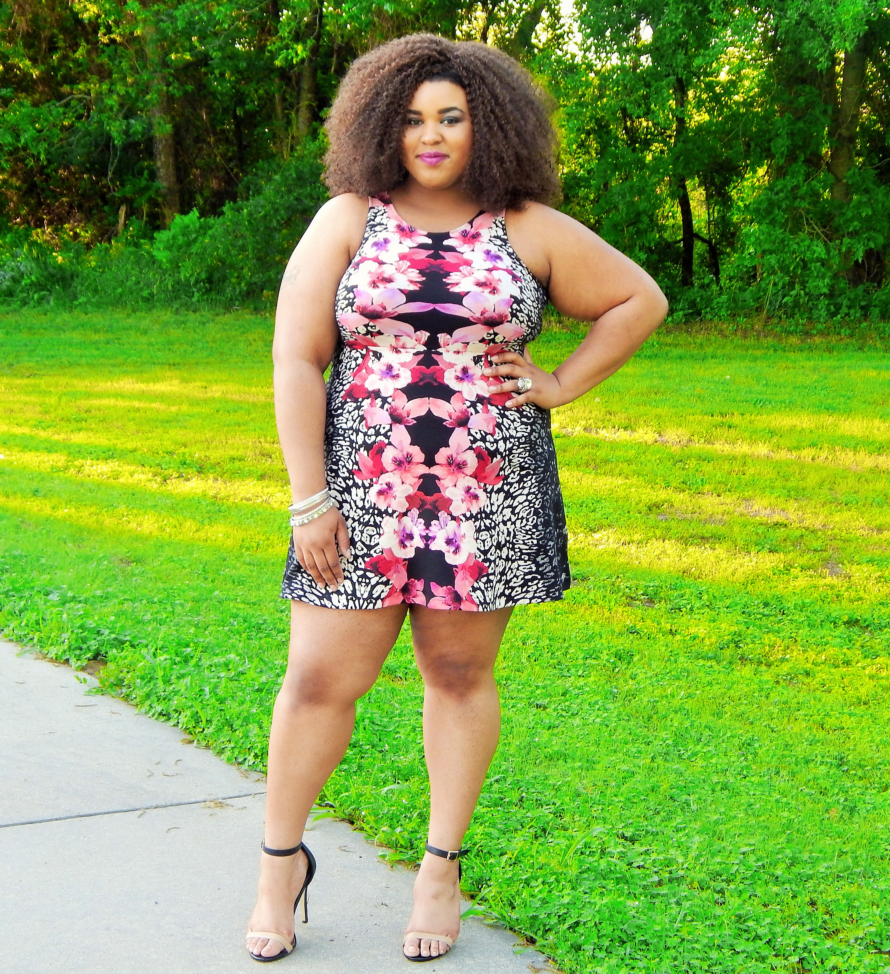 I actually found this dress last year at H&M.. I was looking for the plus section, which the store didn’t have and I was heart broken. I still looked around to see if they had anything else that was cute, including accessories. I found this dress and another chevron striped dress. Unfortunately, they were both larges and I didn’t think they would fit. I held them up and they looked like they would be good enough. I fell in love with this print and had to give it a try. Normally I’m against trying on clothes that are for straight sizes, only because it’s not fair that we have to settle for something that may be ill fitting because the companies refuse to offer the same thing is plus, but you never know what you will find. Once in the fitting room, I was surprised. The dress actually fit! It was a little tight in the breast area, but that’s kind of normal for me because I have a large bust. It wasn’t horrible or please believe I wouldn’t have purchased this dress. I love the symmetrical print on this dress. The colors of the flowers pop with the black and white leopard print on the sides. I can’t wait to see how much more fabulous this dress will look as more spring and summers come along! Here is a similar dress- Forever 21 🙂