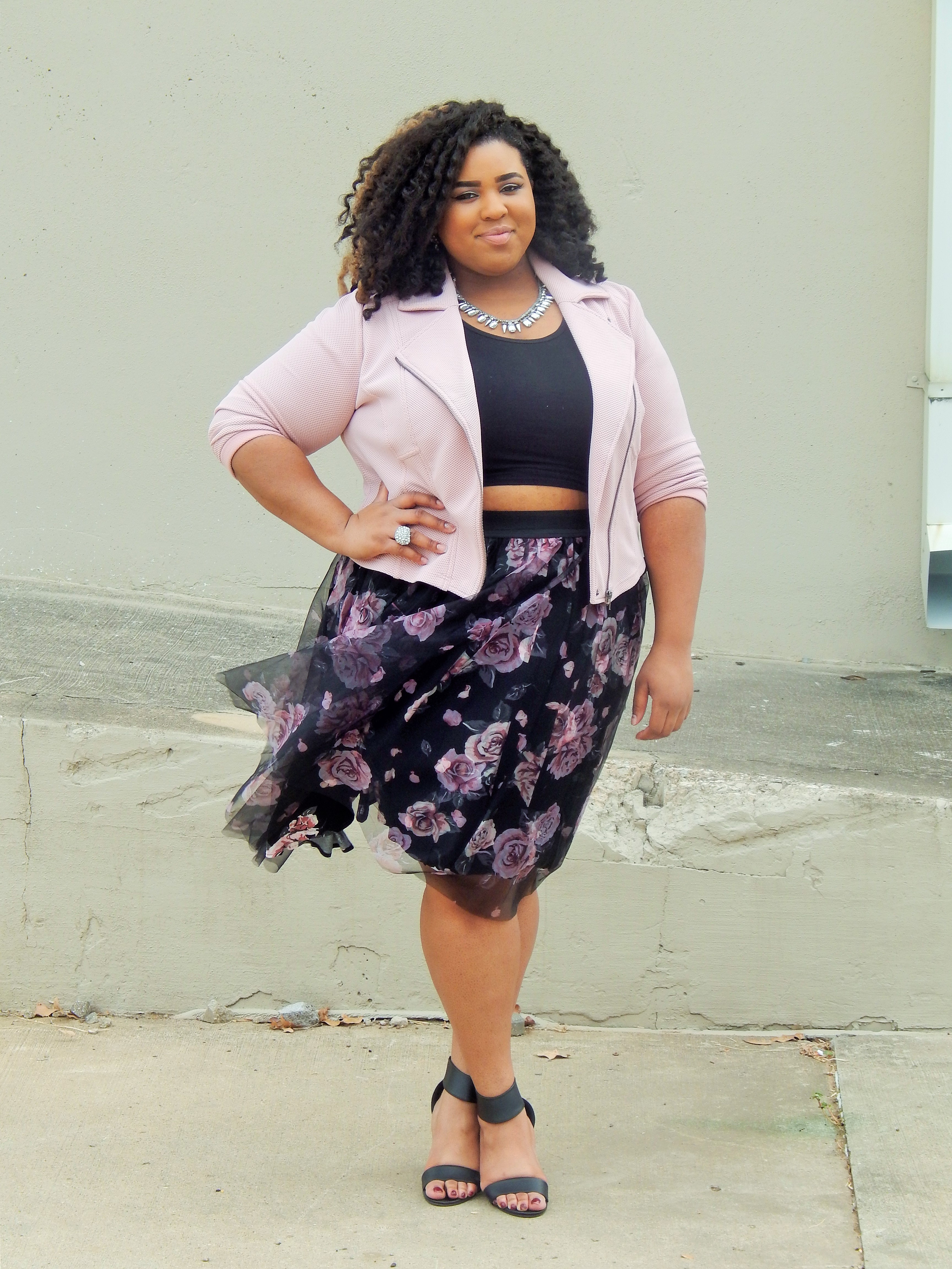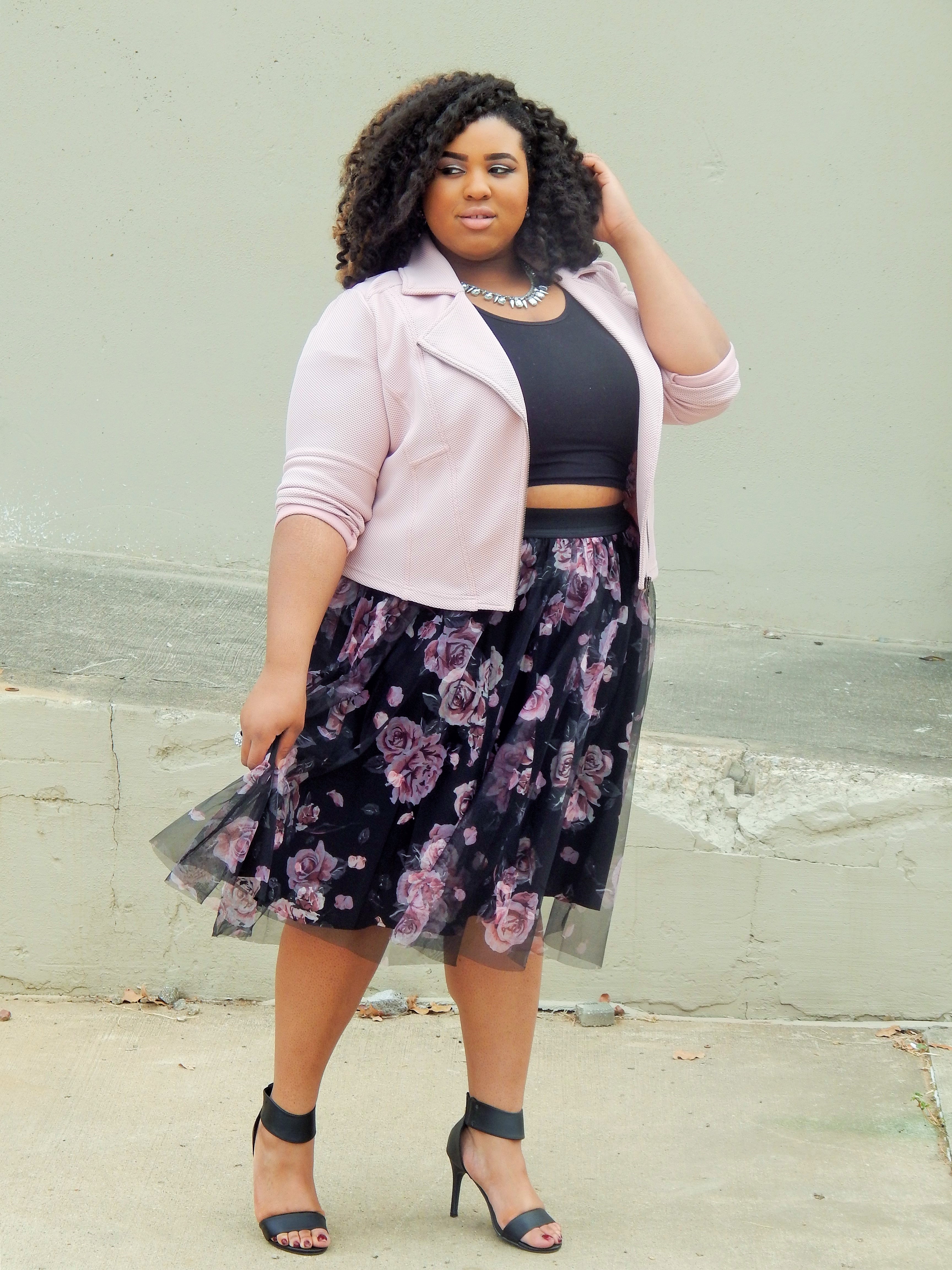 Fall is here and I’m loving the new collection from Torrid. Since I work there, I get to see all of the cutest items and I always put outfits together. When I saw this tulle skirt, I fell in love. It’s different than anything I’ve bought. I usually wear fitting mini, pencil or midi skirts so I was excited. It’s not a full tulle skirt, but it is full enough for me. With only one layer of floral tulle, it provides the right amount of fluff for me! The floral tulle is layered over a floral skirt, creating a multi-floral illusion. This would be something I wear on a date night. It’s cute, fun and flirty. This pink moto scuba jacket is too cute! I love that it’s textured and has really good stretch.